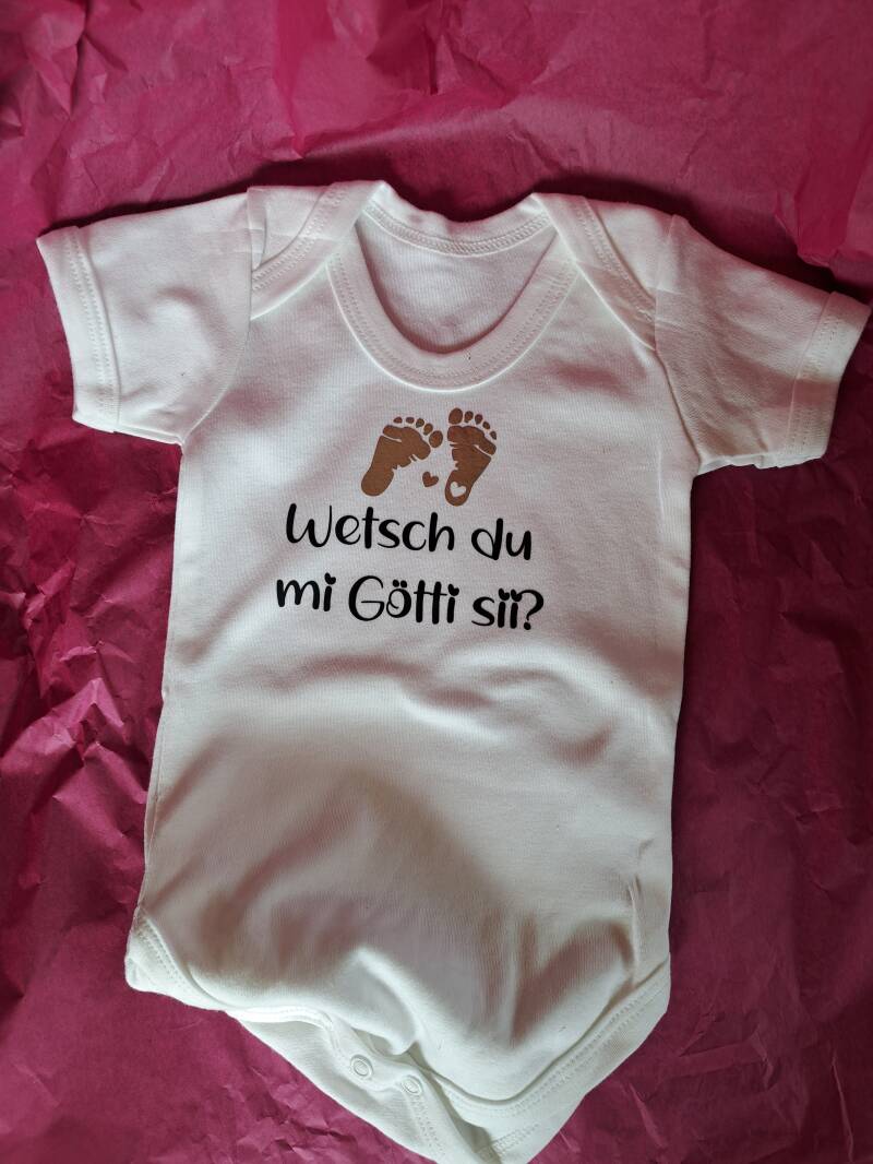 Wetsch mis Gotti/mi Götti sii? Wie wäre es mit so einem süssen Body mit der schönen Nachricht drauf? Oder einem härzigen Chärtli.. Bin auch für neue Vorschläge offen.