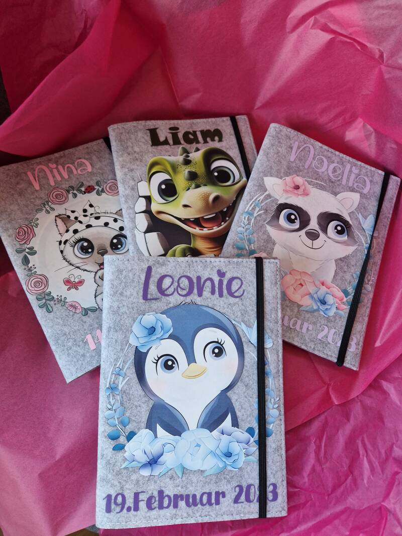 Perfekte Schutzhülle aus Filz, für das Gesundheitsheft deines Kindes. Mit diversen Motiven erhältlich.